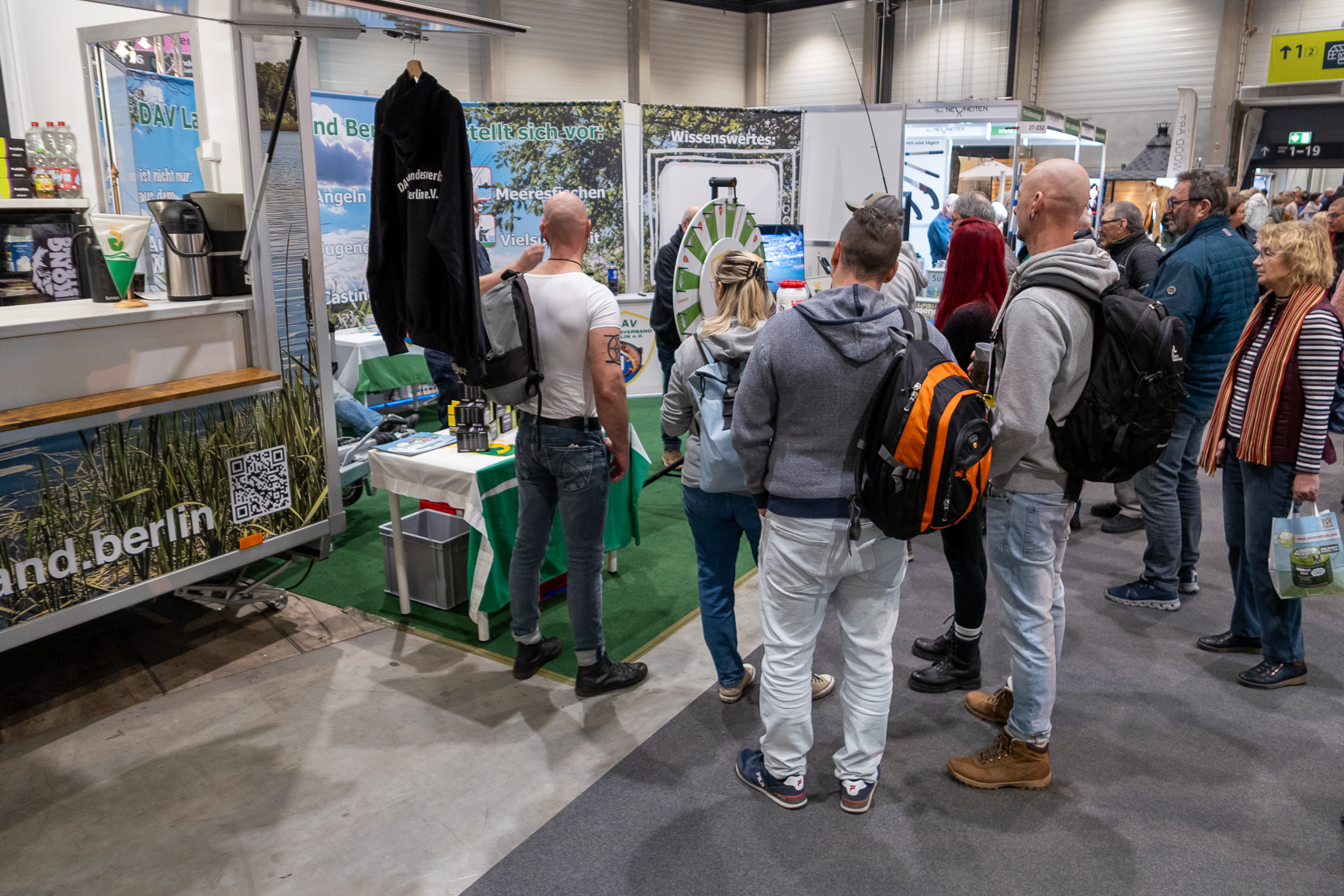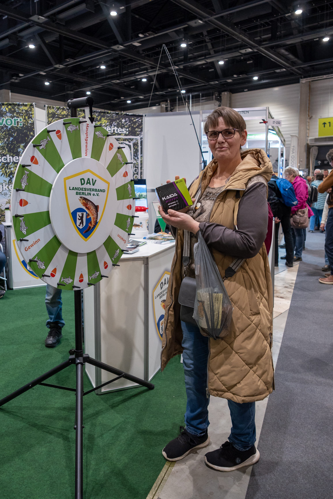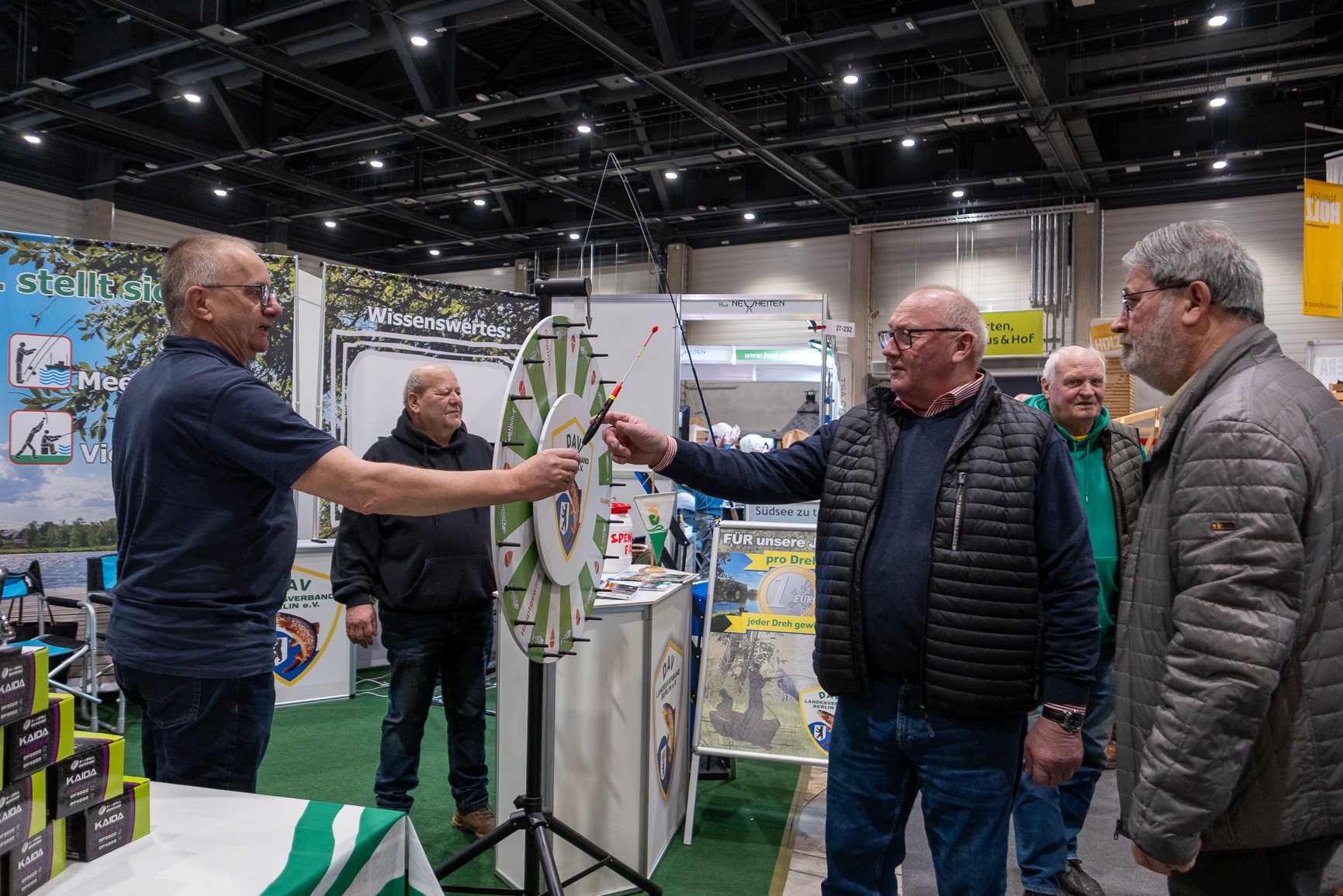 Ganz im Gegensatz zur jüngeren Generation, welche zahlreich in Form von Schulklassen auf der Messe anwesend war. So hörten wir nicht selten den Satz: „Ey, da gibt es Döner“ oder „Hier kam man Döner gewinnen“. Es dauerte ein wenig länger, bis wir es endlich verstanden hatten! Die Wallerpose auf unserem Glücksrad, die den Gewinn einer Pose anzeigt, wurde als Dönerspieß angesehen. Ja, wir sind auf der Grünen Woche und die ist nun einmal nicht eine Angel-Fachmesse, wie es die Angelwelt ist. Und so wurden dann eben die Pose zum Döner und der Gummifisch zum Räucher- / Frischfisch-Gewinn umfunktioniert. Wir hatten unseren Spaß daran, obwohl es irgendwann auf Grund der Häufigkeit auch zum schlechten „Running Gag“ wurde. Aber egal, hat doch das Glücksrad auch auf der Grünen Woche wieder für einen reichlichen Geldsegen, der unserer Jugendarbeit zugutekommt, gesorgt. Die heiseren Stimmbänder am Tagesende haben wir dafür gern in Kauf genommen.